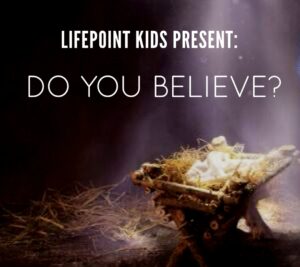On Sunday, December 14th our Lifepoint Kids will be sharing the Christmas story in a production entitled “Do You Believe?” We are excited because not only will this be an incredible production, but it will also be our first service in our new auditorium! The kids are very excited to show everybody what they have been learning about Jesus and what Christmas is truly about. We encourage you and all of your family to join us!